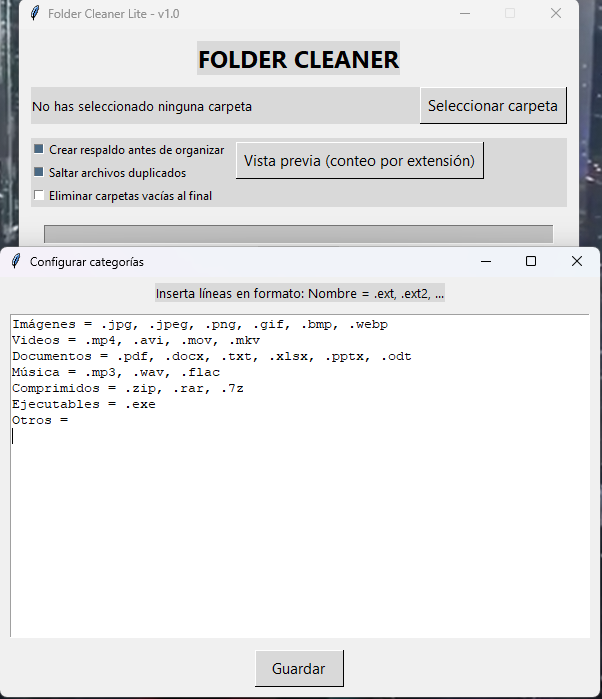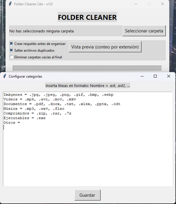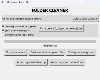 Folder Cleaner pro es una herramienta sencilla para mantener tus carpetas organizadas. Con un solo clic, la aplicación analiza tus archivos y lo ordena por categorías como imágenes, documentos o videos. Incluye la función Edición de Categorías que te permite personalizar a donde va cada tipo de archivos. Ideal para estudiantes, creadores de contenido, trabajadores de oficina o cualquier persona que acumule archivos sin orden.